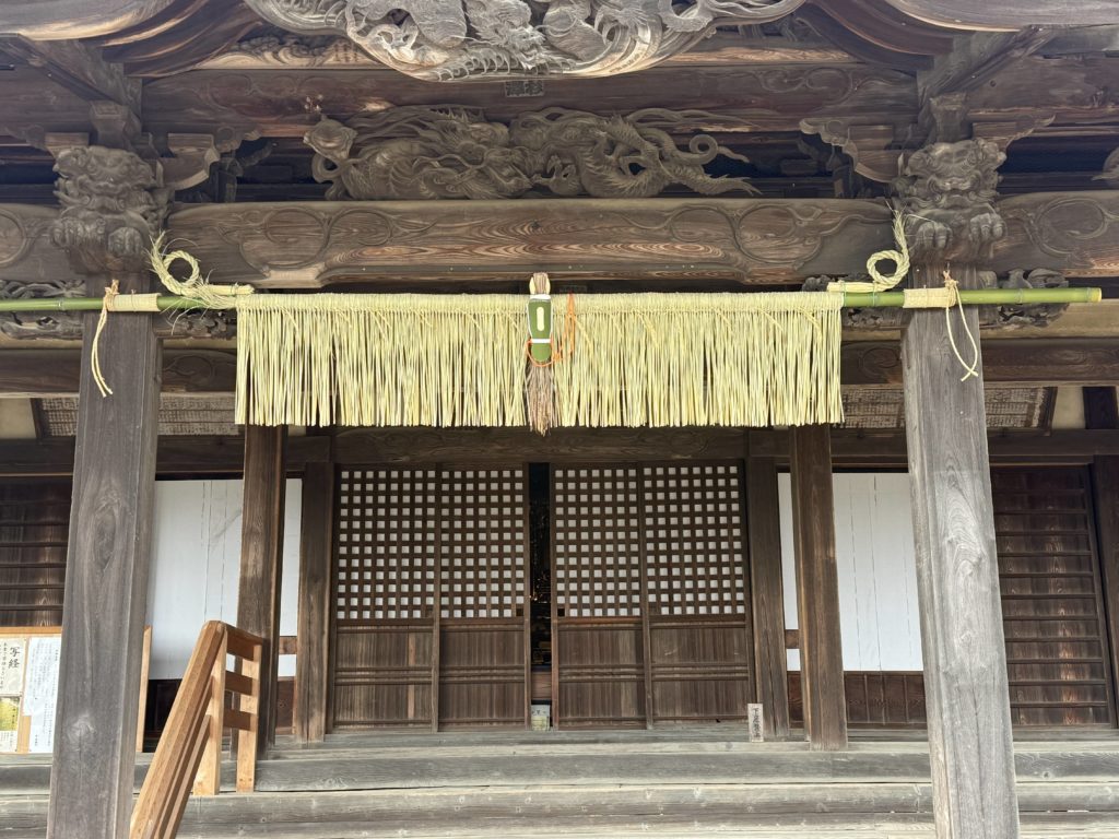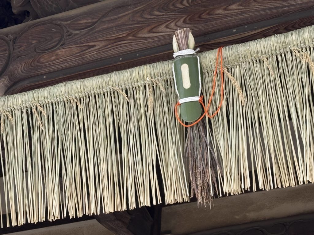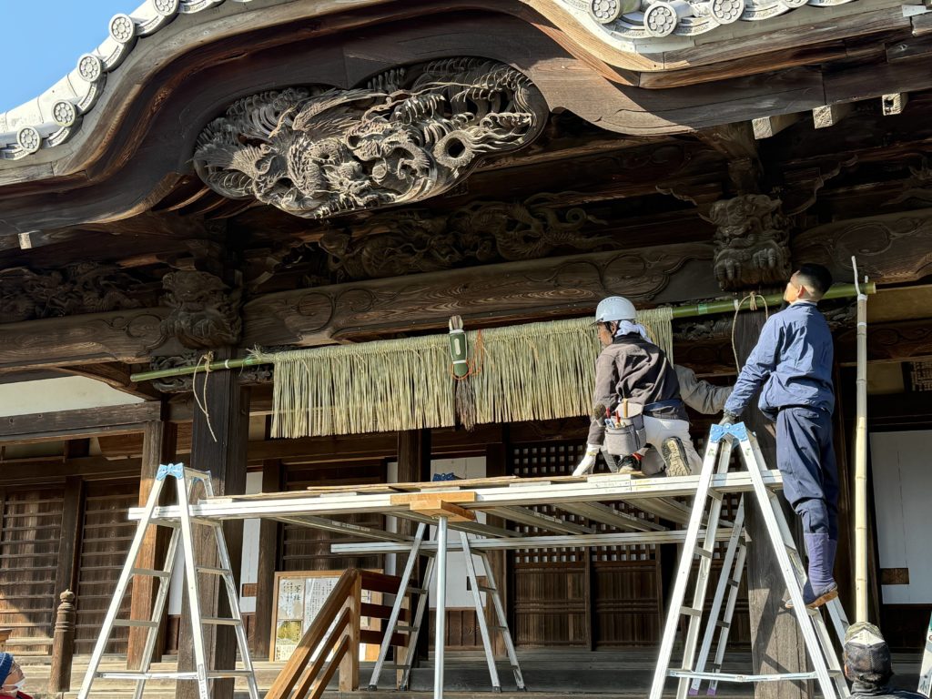 二年前からお願いしている「わら細工保存会」による正月飾り。来年は午年ということで、このような形になりました。両端のクリンとなっているのが手綱だそうです。このわら細工用の藁は、苗を植えて実がなる前に収穫された専用の藁です。大相撲の土俵にも使われる「白毛餅」種。 お参りの際にぜひご覧ください。 作業頂いているのは、大工の寺島さんとお仲間 Categories: 行事